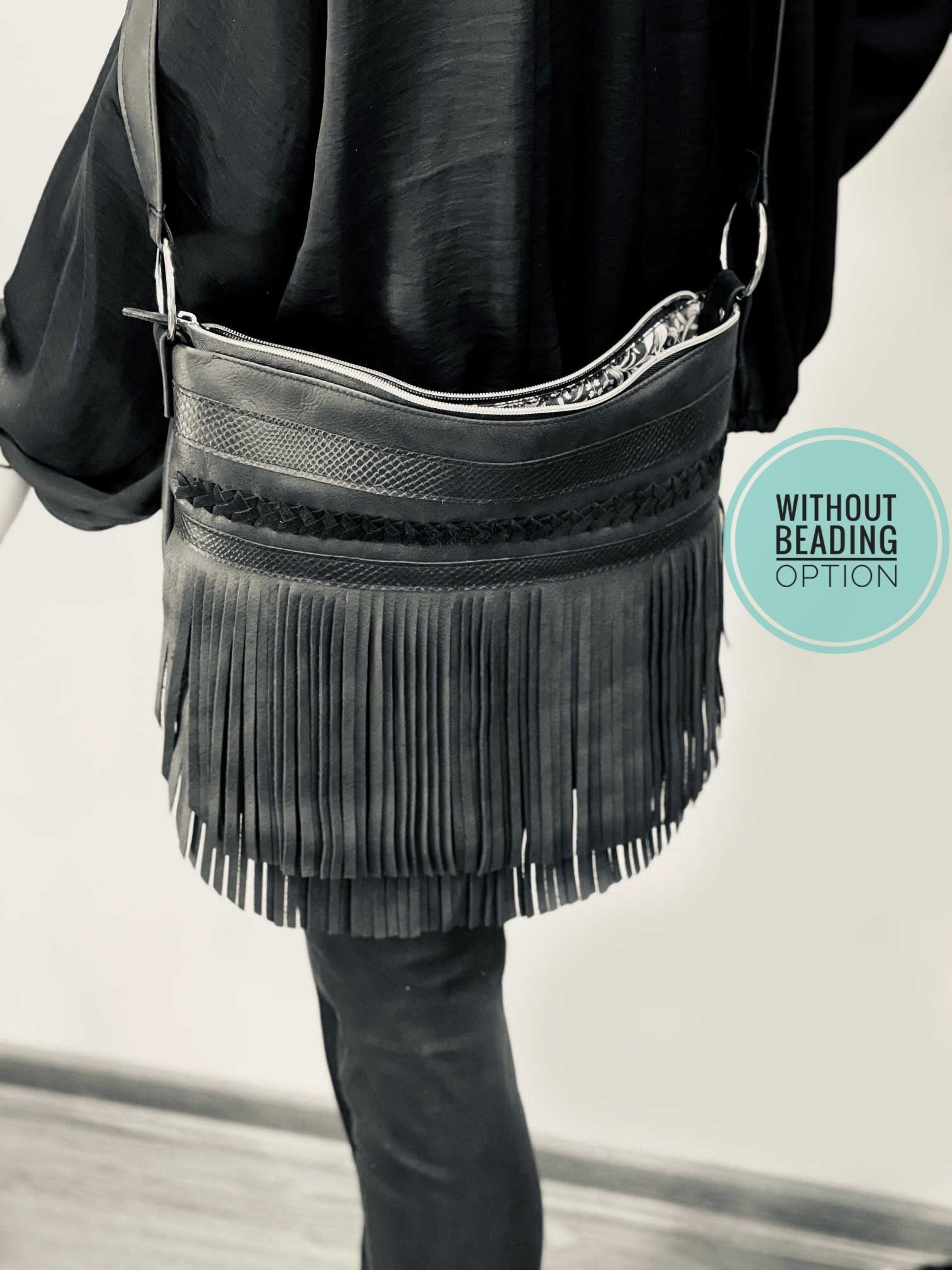 Black Double Fringe Bag, boho braided leather