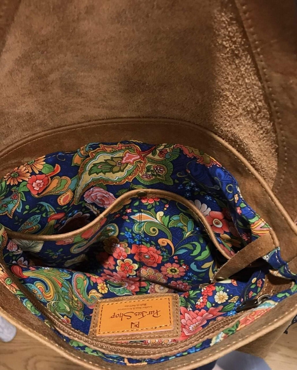 MEDIUM SIZE 3 inside pockets, leather edged and riveted. Size: 35cm wide x 30cm (13.5 inch x 12 inch) Depth at bottom: 7cm (2.8 inch)