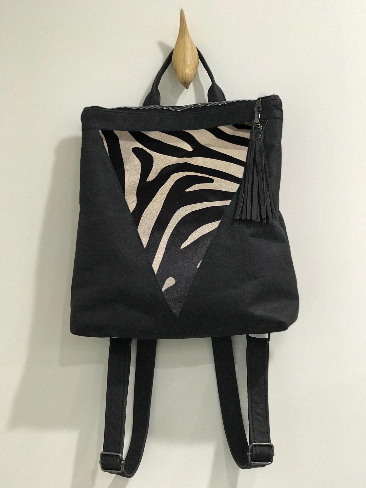 Zebra print on soft cowhide and black Leather Backpack