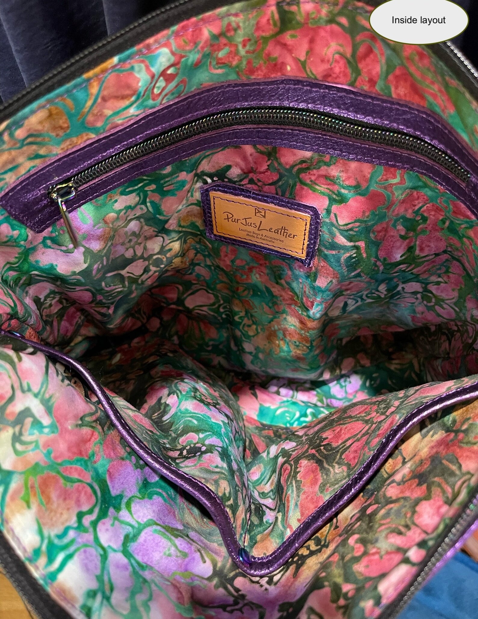 - 2 inside slip pockets, leather edged and riveted , 1 wide zipper pocket