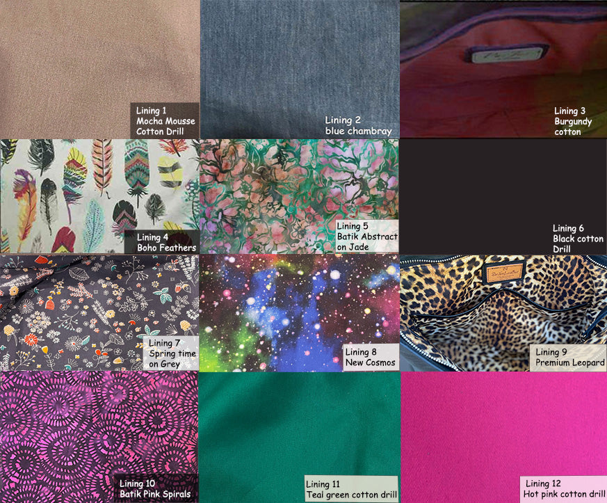 • Choose your lining (see image for lining options and leave your selection in your Order Note.