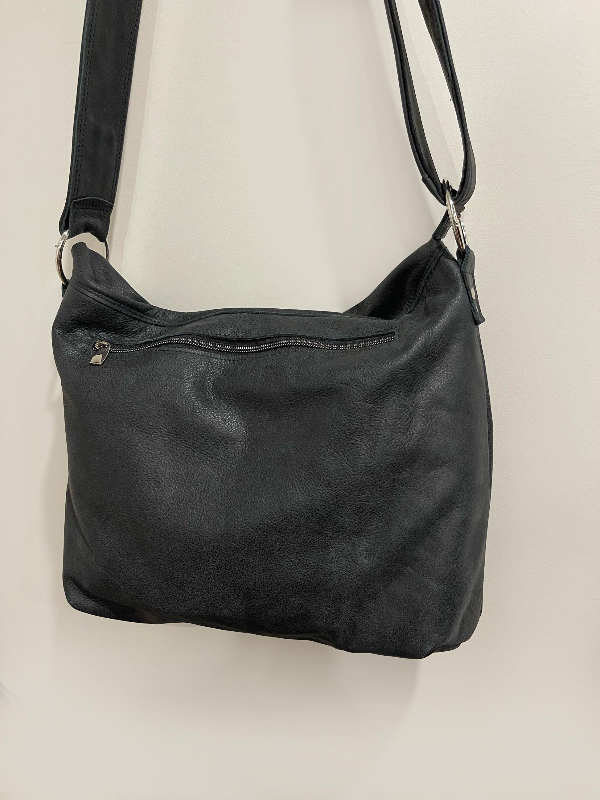 Distressed Black Leather Crossbody Bag with asymmetrical flap