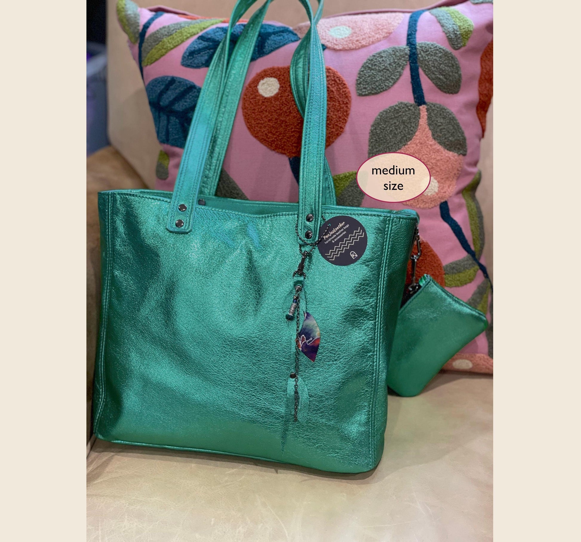 Emerald Green Leather Tote with leather pocket and purse