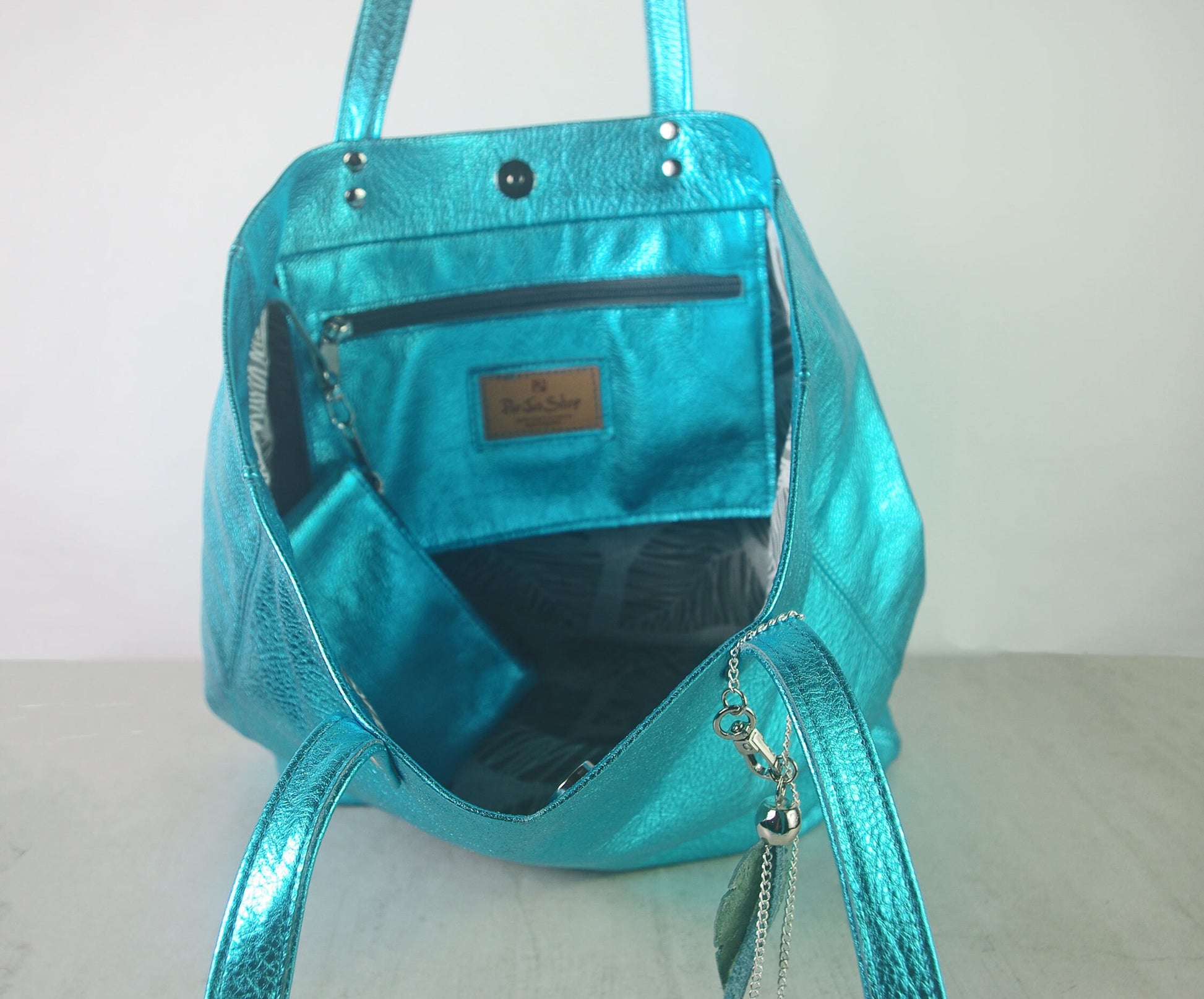 Metallic Turquoise Leather Tote, free leather zipper purse