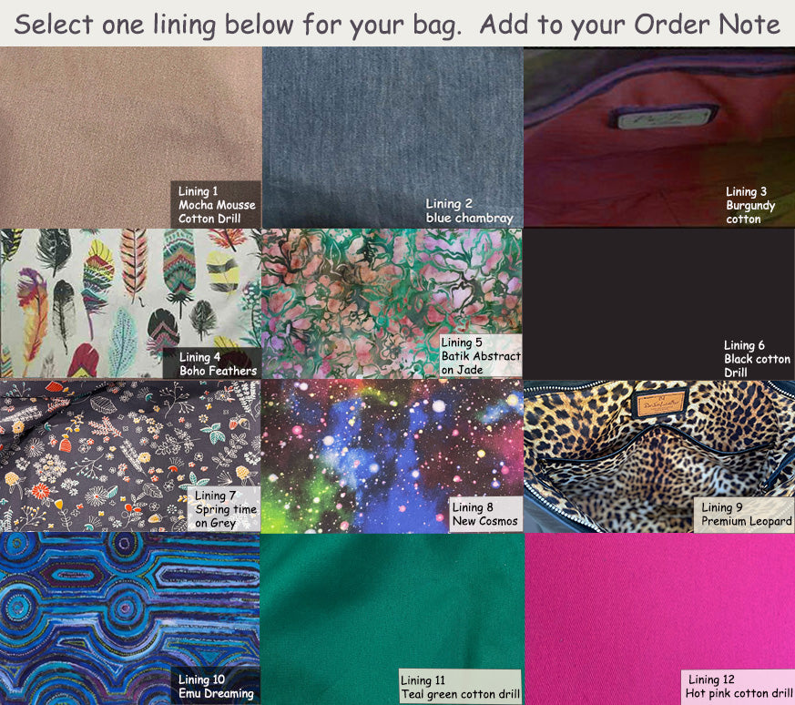 - Fully lined - choose lining from photo and add the lining no. to your Order Note