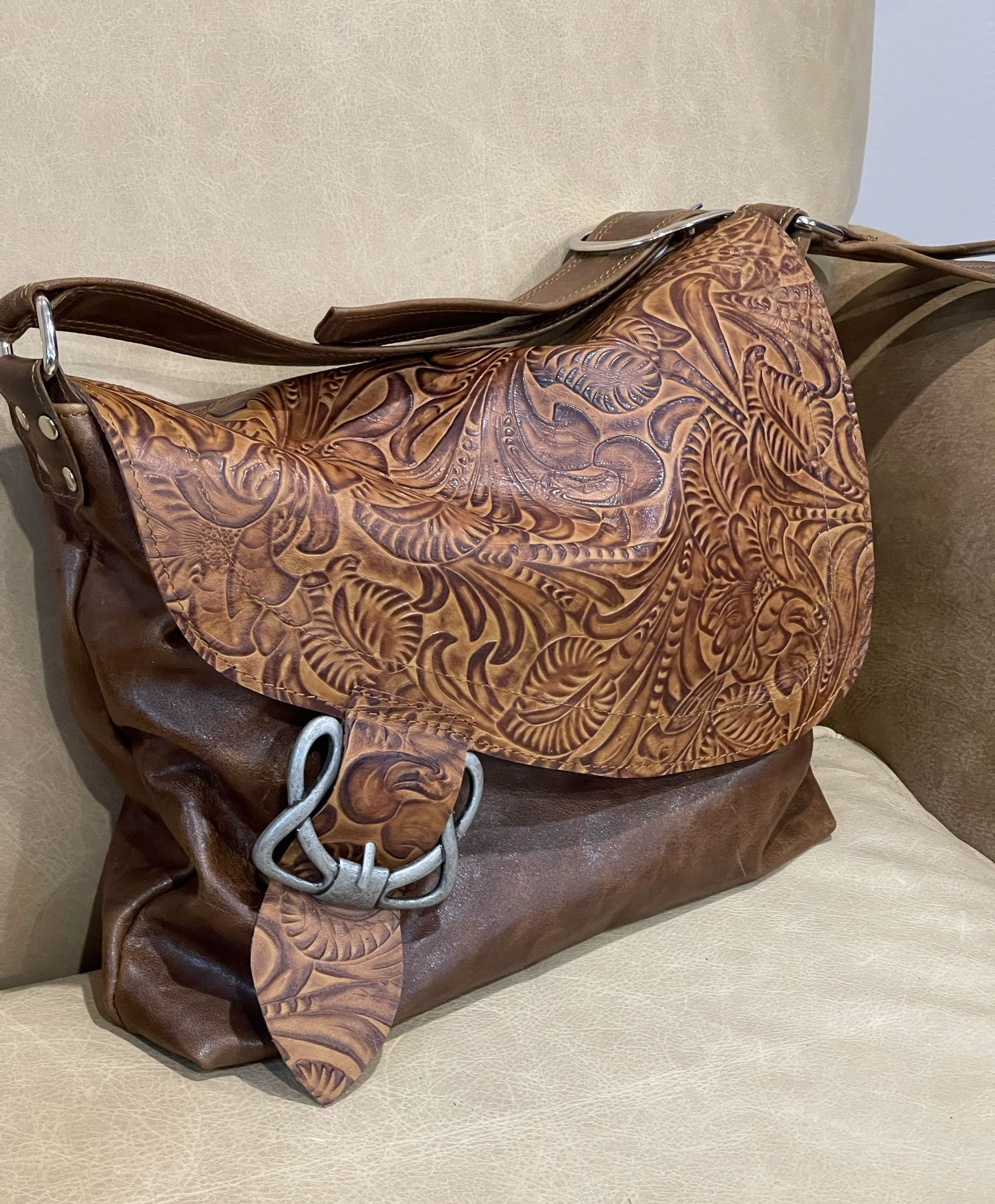 Caramel brown Tooled Leather Crossbody Bag