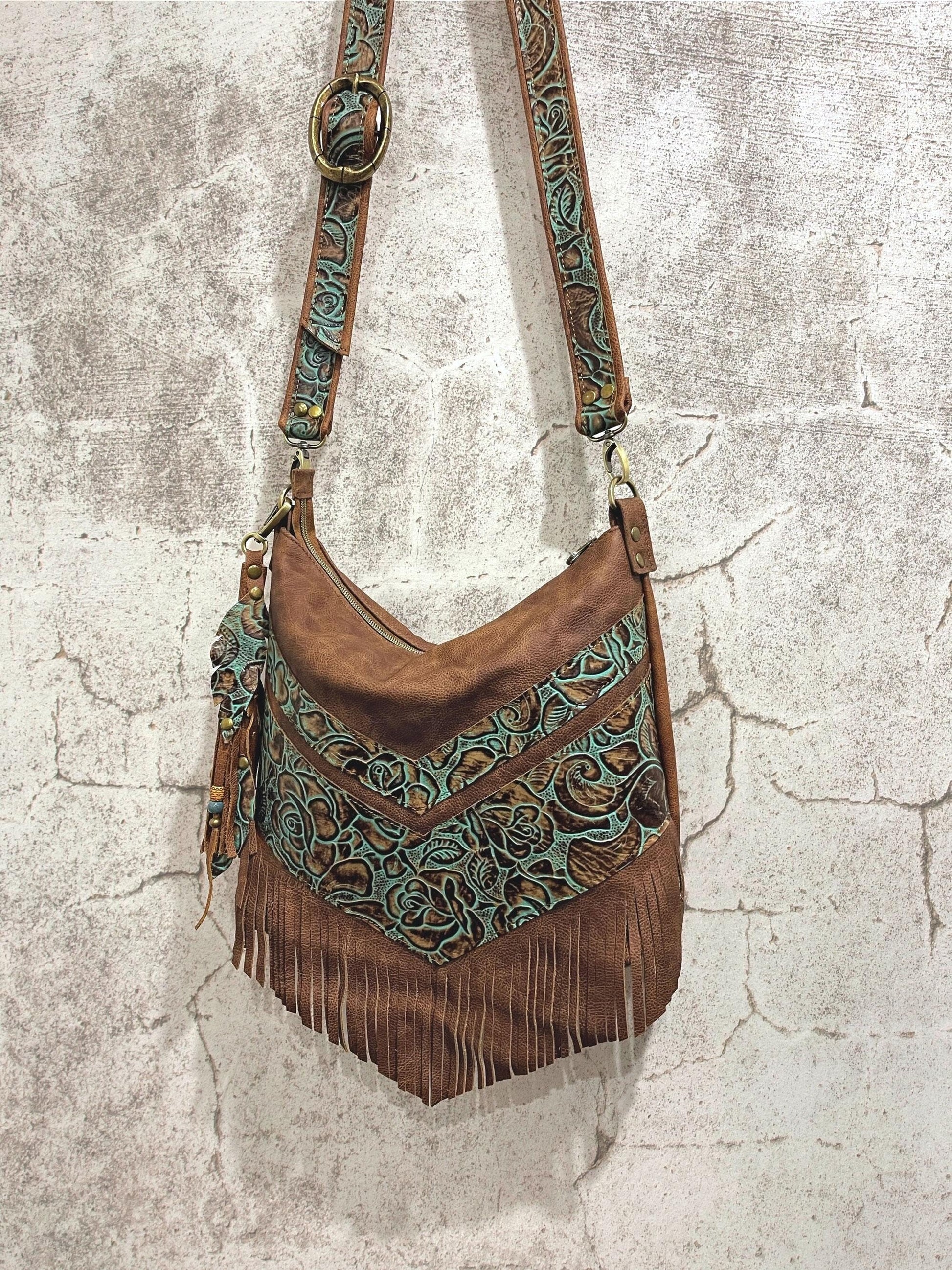 Tooled turquoise and brown Leather Fringe Boho crossbody/shoulder Bag