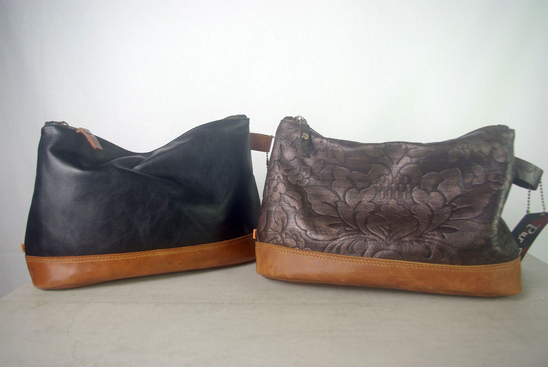 Italian Black Leather with Vintage Cognac toiletry bag